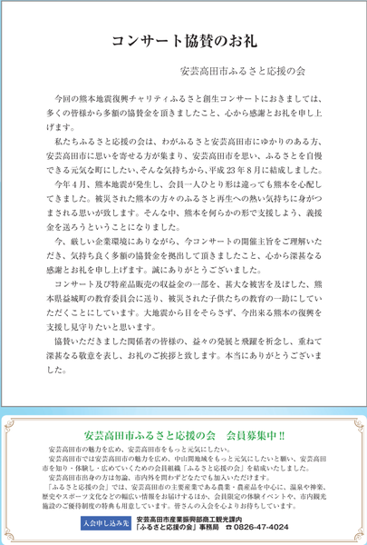 先月初めに、開催された「ふるさと創生コンサート」を無事に終えることができました。コンサートの開催にあたり、ご理解とご協力をいただき、ご協賛をいただきました皆様に改めて感謝と御礼を申し上げます。
