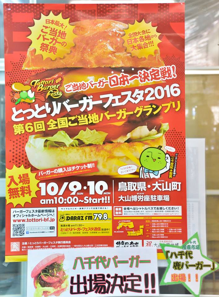 今週の3連休後半、10月9日(日)・10日(月)に開催されます「とっとりバーガーフェスタ2016 全国ご当地バーガーグランプリ」へ八千代産直市場の「八千代鹿バーガー」が広島県を代表して出場します!!