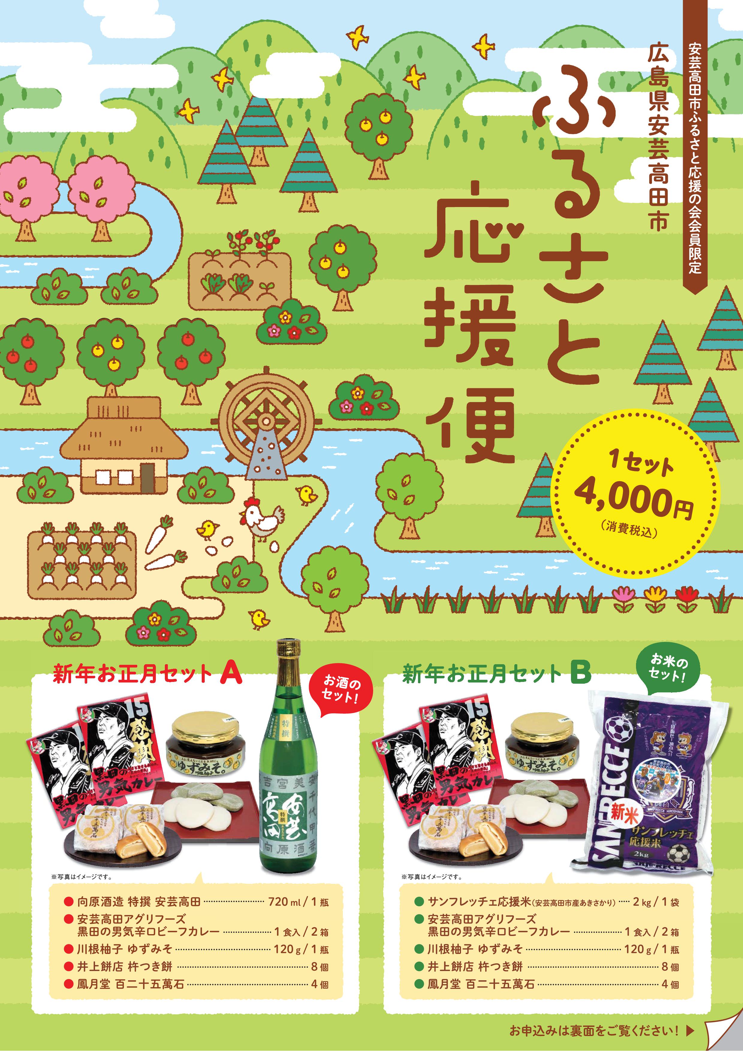 ふるさと安芸高田市を離れていらっしゃる会員の皆様に、安芸高田市外、広島県外のお知り合いの方に地元の味をとの思いで、お正月にあわせてふるさと安芸高田市の味を詰め込んだ「ふるさと応援便」をご用意いたしました。お正月に欠かせないおもちをはじめ、地元のお米・お酒や、おせち料理に飽きたら食べたいカレーなどをセットにしました。注文申込は下記添付の注文用紙を印刷して、必要事項をご記入いただき、FAXにてご注文ください。皆様からのご注文をお待ちしております。