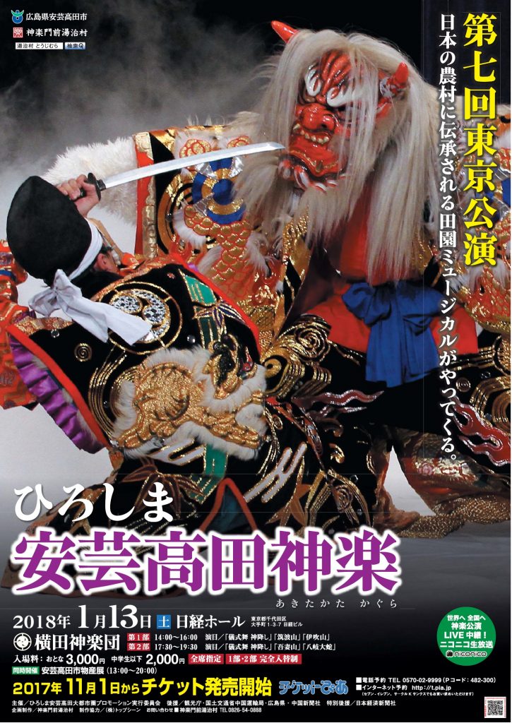 平成30年1月13日(土)に東京都千代田区大手町の日経ホールにおいて、「ひろしま安芸高田神楽 第7回東京公演」が開催されます。今年の上演神楽団は美土里町の横田神楽団です。チケットについては、チケットぴあで11月1日より販売を開始されています。ふるさと安芸高田が誇る神楽を東京で観ることのできる貴重な機会ですので、関東地区会員の皆様は観に行かれてはいかがでしょうか?