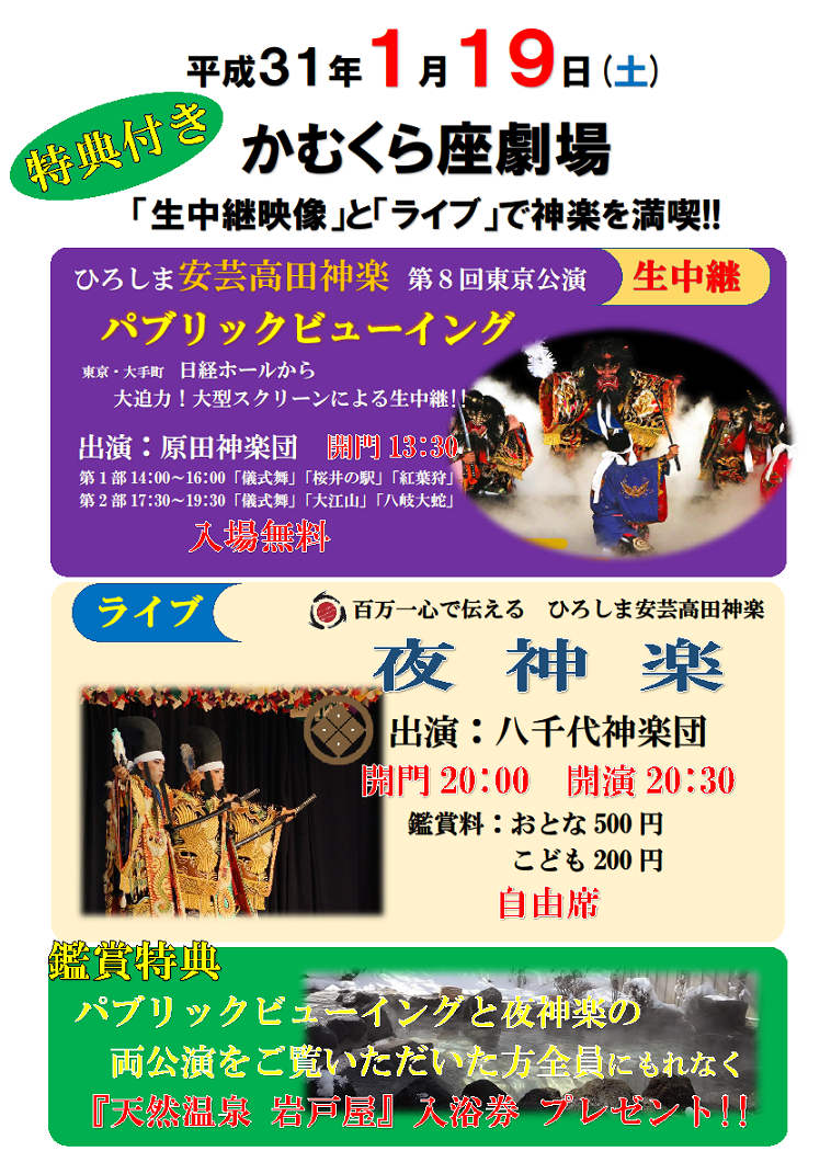 今年で8回目となる、ひろしま安芸高田神楽東京公演のパブリックビューイングが神楽門前湯治村のかむくら座劇場で実施されます。