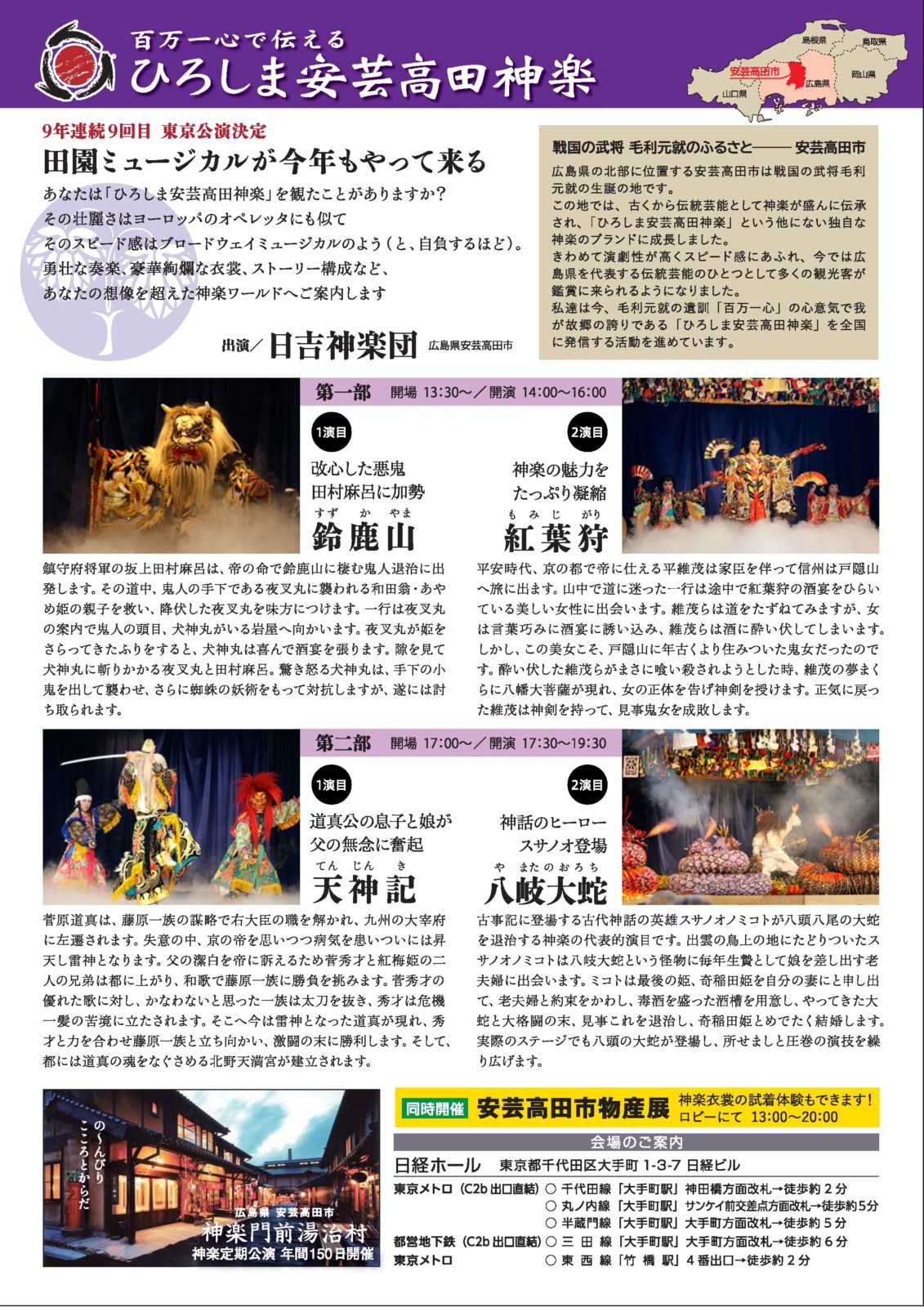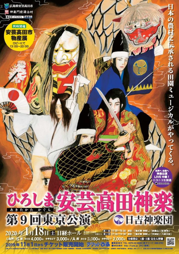 令和2年1月18日(土)に東京都千代田区の日経ホールで、「ひろしま安芸高田神楽第9回東京公演」が開催されます。今年は安芸高田市美土里町の「日吉神楽団」が上演されます。当日は会場で安芸高田市の物産展も開催されます。関東地区会員の皆様はぜひこの機会にふるさと安芸高田の神楽をご覧になられてみてはいかがでしょう。