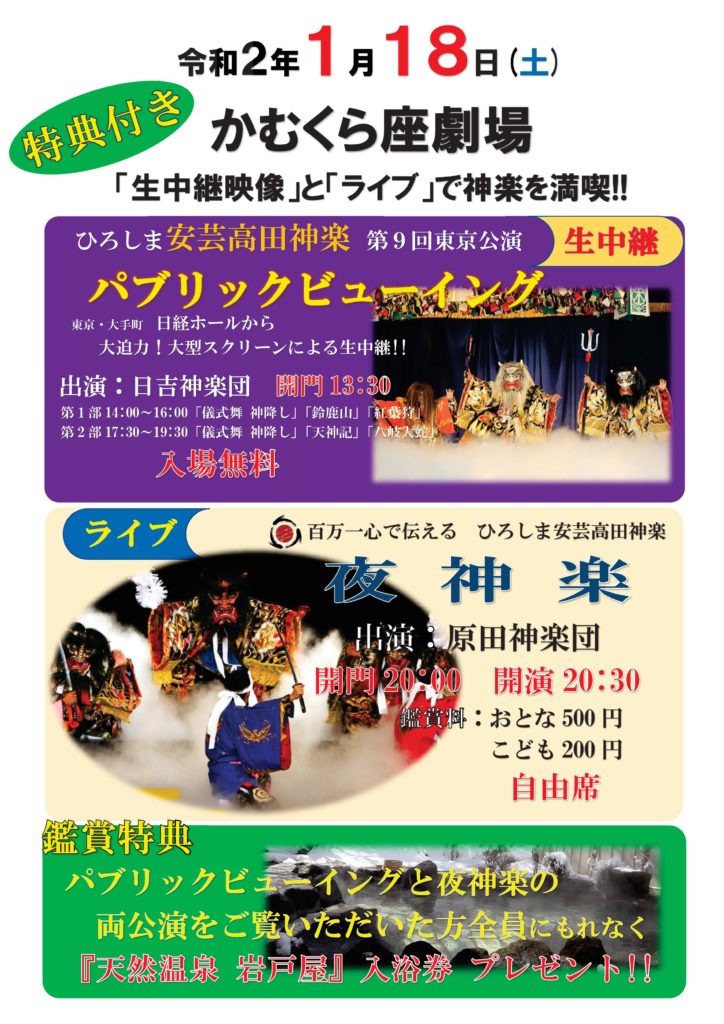 また、あわせて地元安芸高田市の神楽門前湯治村では第9回東京公演のパブリックビューイングが開催されます。安芸高田市、広島の会員の皆様もぜひ東京公演の様子をライブで楽しんでみてください。
