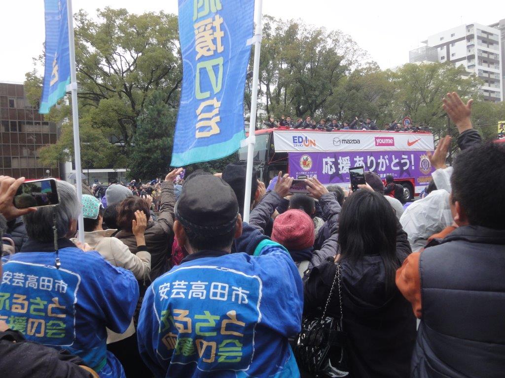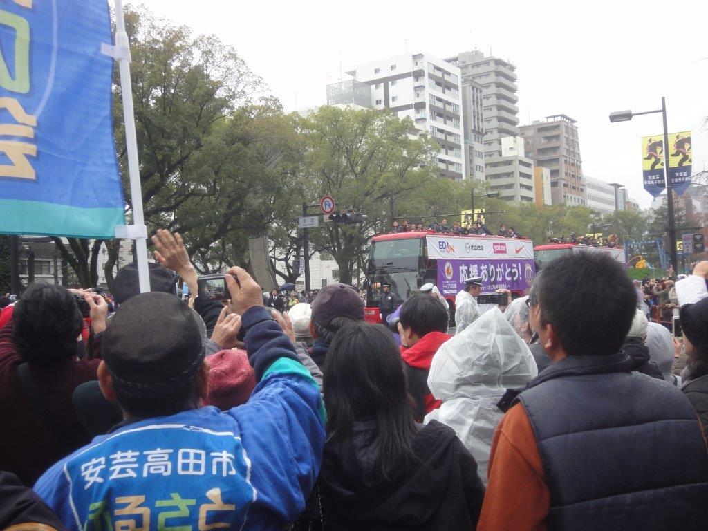 年末の大掃除やら正月の準備やらで、何かとあわただしくしております事務局中溝です。 (^^;) 2015年12月23日(水・祝)にサンフレッチェ広島の優勝パレードが開催されました。 (14:00~14:30 コース:平和大通り 白神社前交差点付近スタート~田中町交差点付近) マザータウンである安芸高田市としては、見逃せないってことで! 安芸高田市ふるさと応援の会広島のみなさんが、パレードを盛り上げに行ってきました。