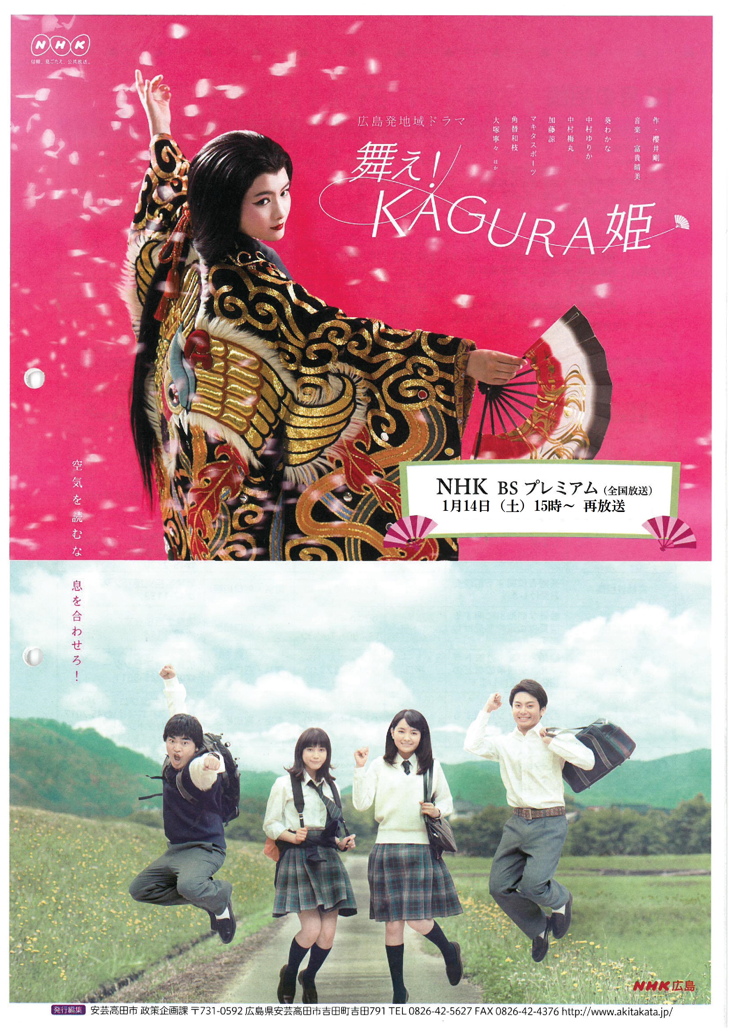 安芸高田市内でロケが行われ、昨年11月30日に放送がありましたNHK広島発地域ドラマ「舞え!KAGURA姫」が再放送されます。前回の本放送を見逃された方はもちろん、見られた方も見返すことで新たな気づきもあると思います。今回は土曜日午後の時間帯の放送です。ぜひぜひ「舞え!KAGURA姫」の再放送をご覧ください。