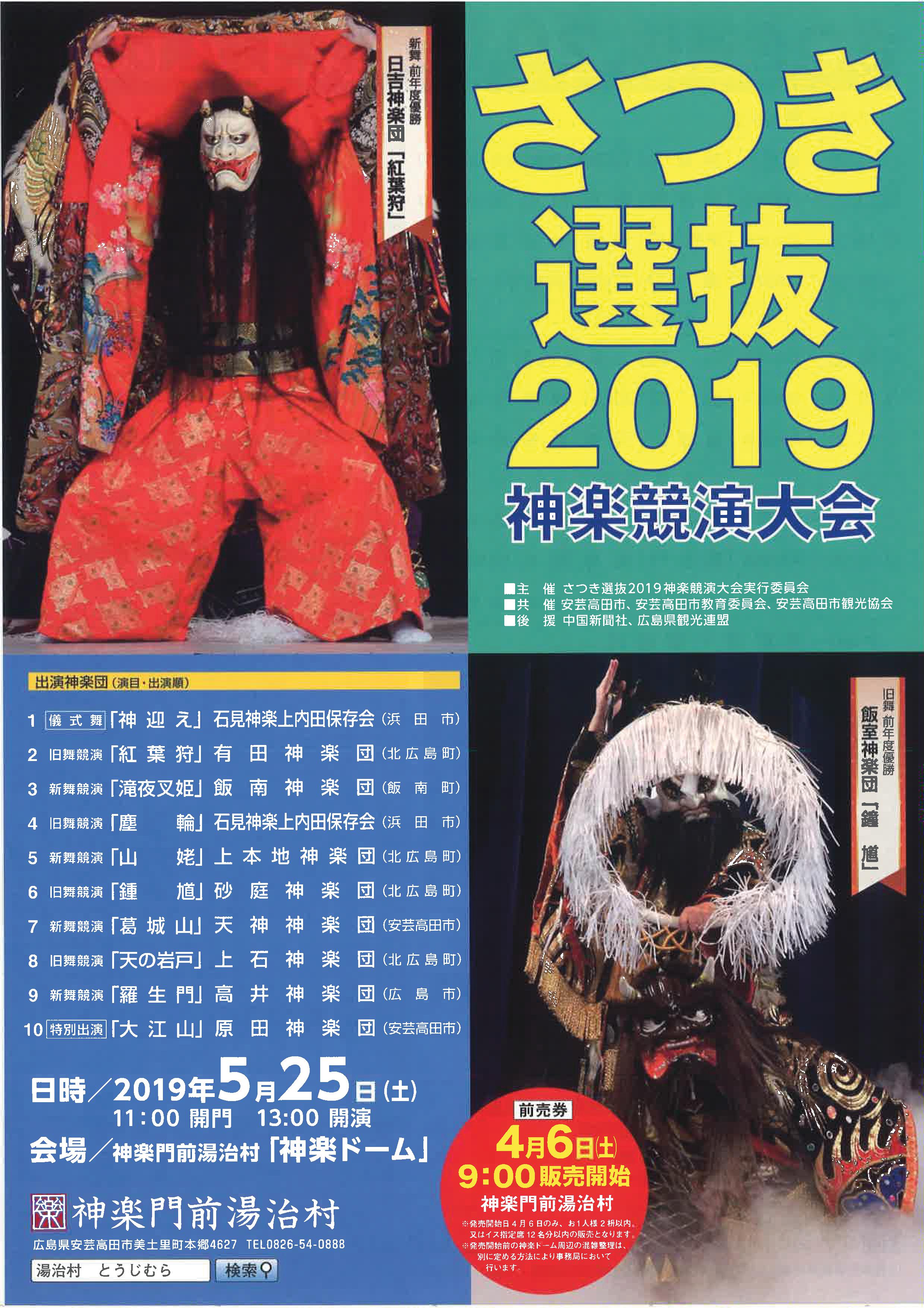 2019年5月25日(土)に安芸高田市美土里町の神楽門前湯治村で「さつき選抜2019 神楽競演大会」が開催されます。競演には旧舞、新舞それぞれ4団体が出演し、各神楽団が研鑽を積んだ舞を披露されます。地元安芸高田市からも特別出演をあわせて2団体が出演します。5月最終の土曜日に神楽競演を観に出かけられてはいかがでしょうか?