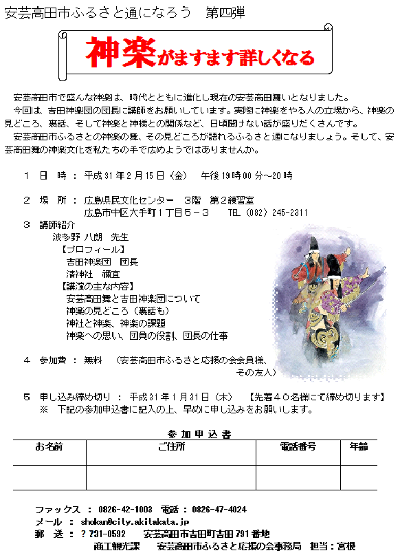 安芸高田市ふるさと応援の会広島では、平成31年2月15日(金)に、安芸高田市ふるさと通になろう第4弾と題し、神楽講座を開催します。