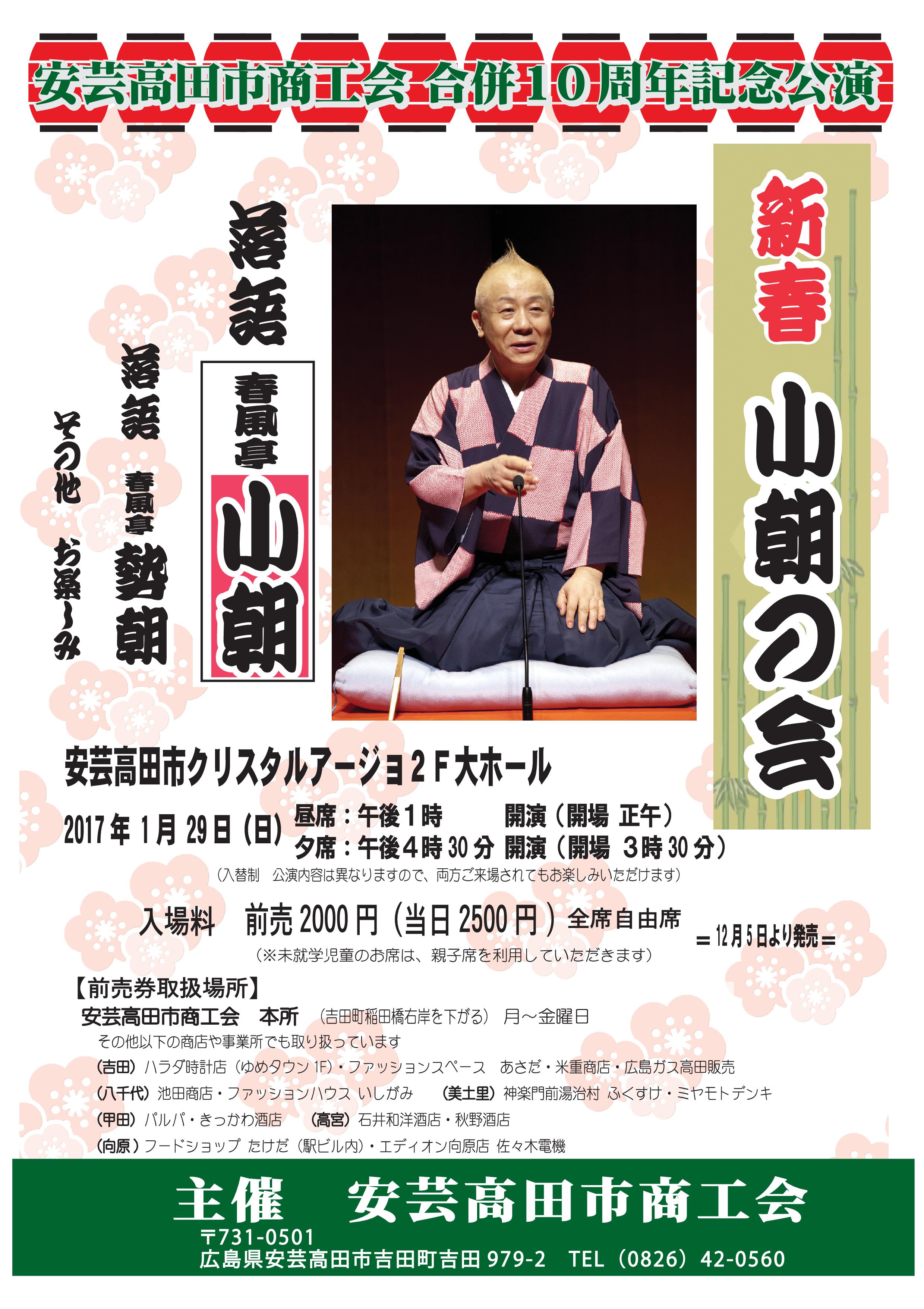 来年1月29日(日)、安芸高田市商工会合併10周年記念公演「新春 小朝の会」が安芸高田市クリスタルアージョ2階大ホールにて開催されます。春風亭小朝、春風亭勢朝の落語を安芸高田市内で聴けるまたとない機会です。公演は全席自由席で、午後1時からの昼席、午後4時30分からの夕席の2回公演(入替制で公演内容は異なりますので、両方ご来場されてもお楽しみいただけます。)前売入場券の販売も開始しております。皆様、ぜひ新春のイベントにご来場ください。