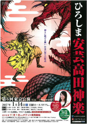 今年の1月にも開催しました「ひろしま安芸高田神楽 東京公演」につきまして、来年2017年1月14日(土)に千代田区の日経ホールで「第6回公演」が開催されます。ふるさと応援の会関東地区会員の皆様はもちろん、お知り合いが関東にいらっしゃいましたら、ぜひご紹介ください。関東でふるさとの伝統芸能「神楽」を楽しめる機会ですので、ぜひお越しください。