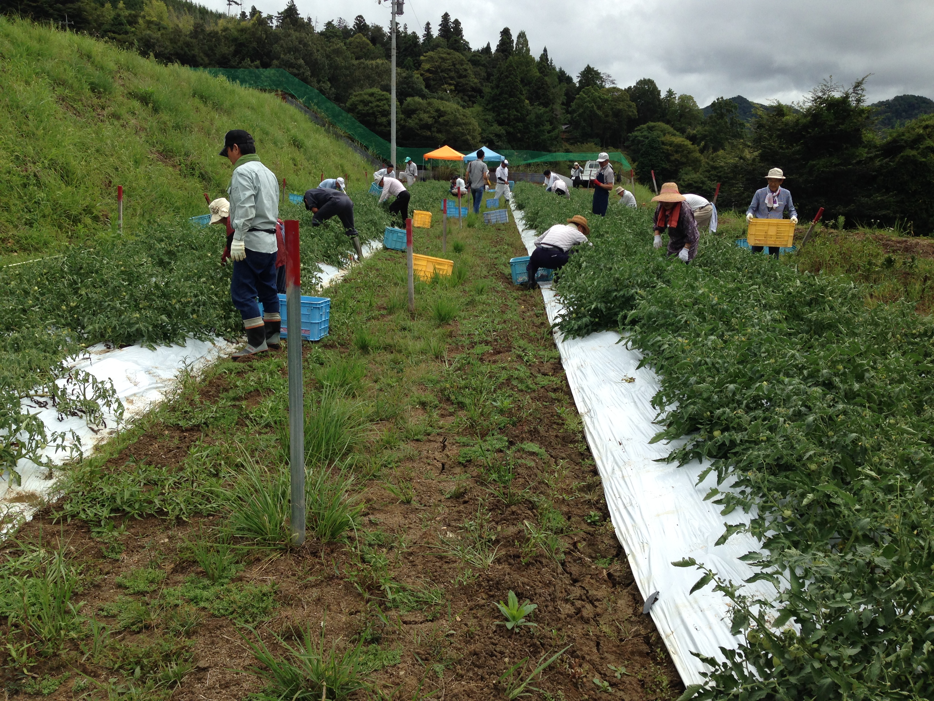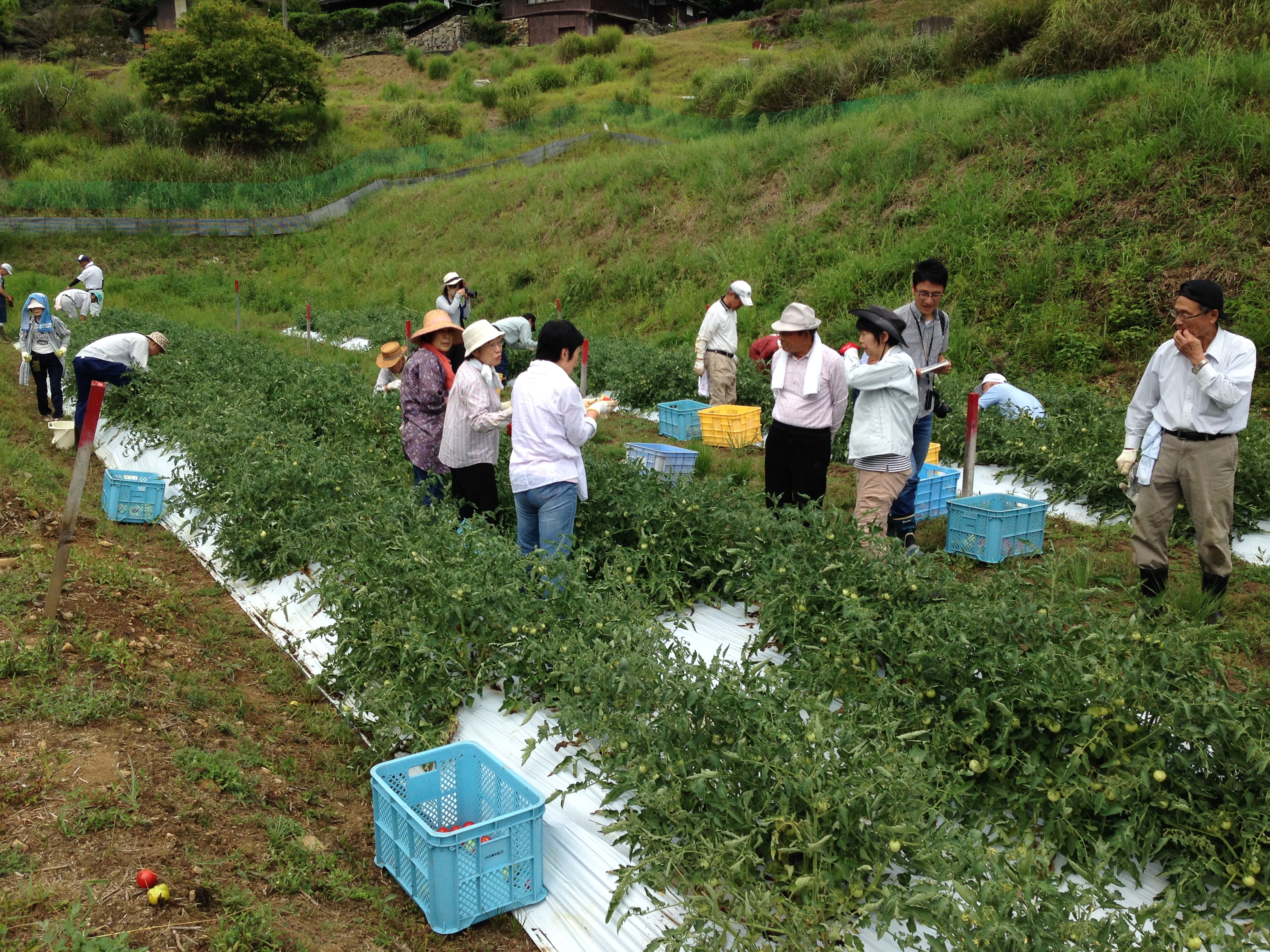 地這いのトマトなので葉の陰に隠れている実を葉をかき分けながらひとつひとつ丁寧にもぎ取ってコンテナに集められました、調理用のため赤く実ったものや少し色付いたものも一緒に収穫しました。