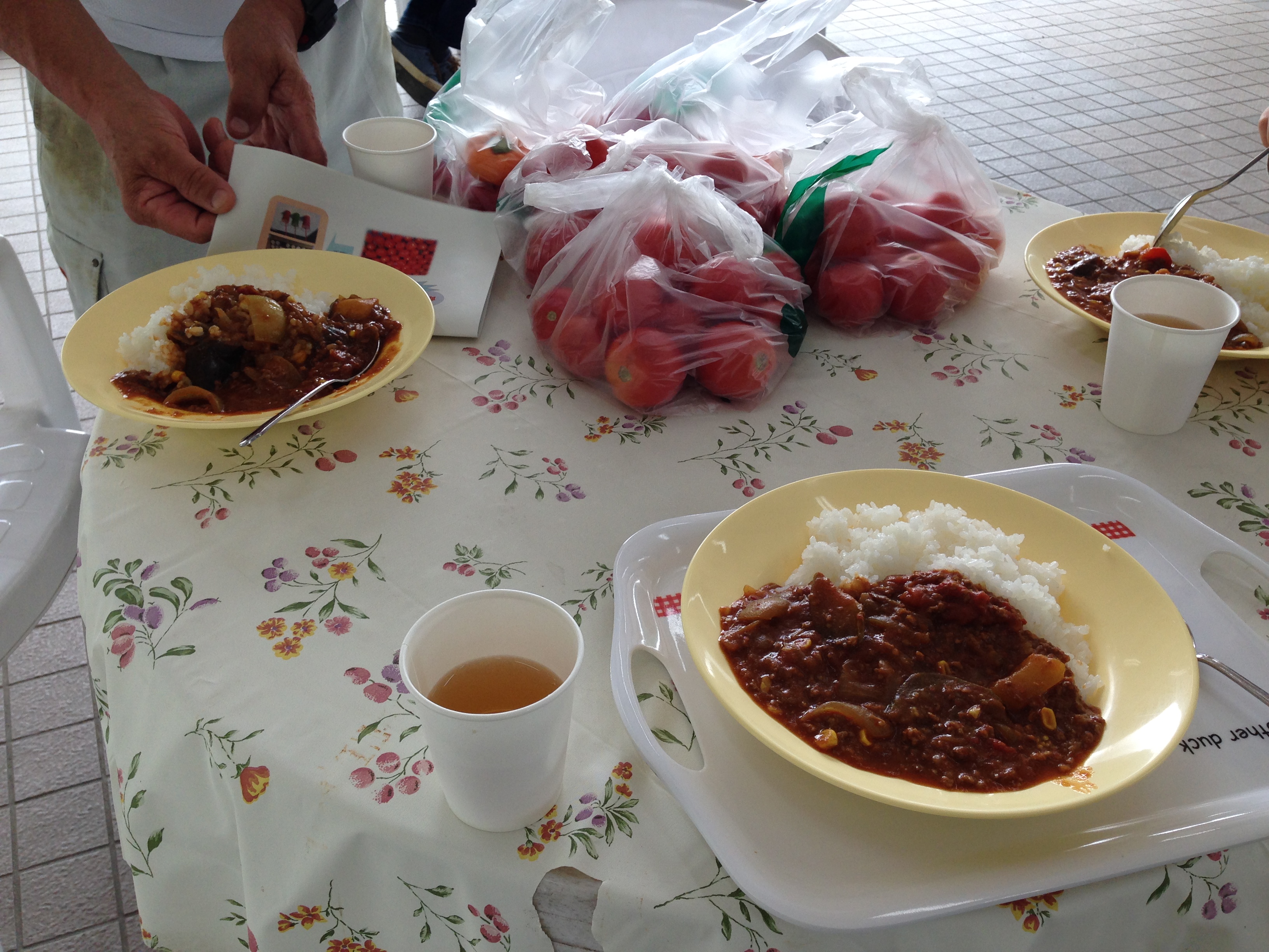 収穫を終えてやすらぎ館に帰って昼食はトマトカレーです、トマトの果肉もたくさんでパブリカやナスも入った野菜カレーを美味しくいただきました。