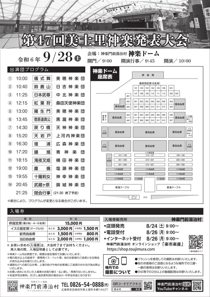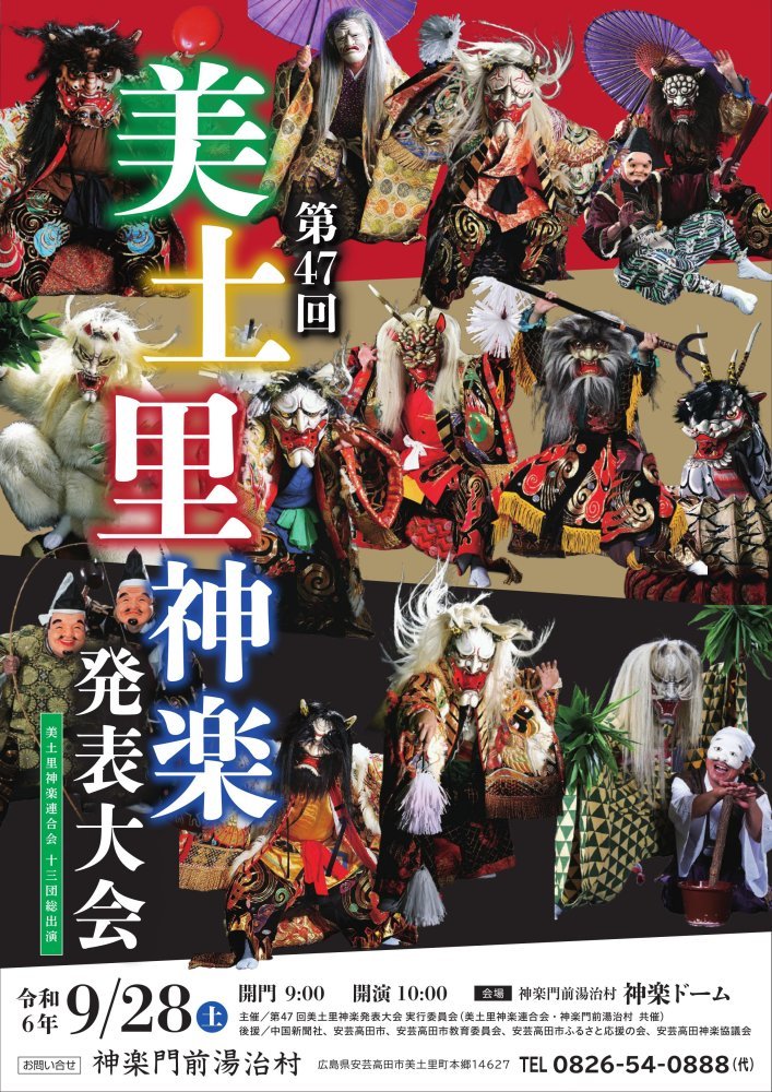 2024年9月28日(土)に、神楽門戦湯治村神楽ドーム(安芸高田市美土里町)にて「第47回 美土里神楽発表大会」が開催されます。