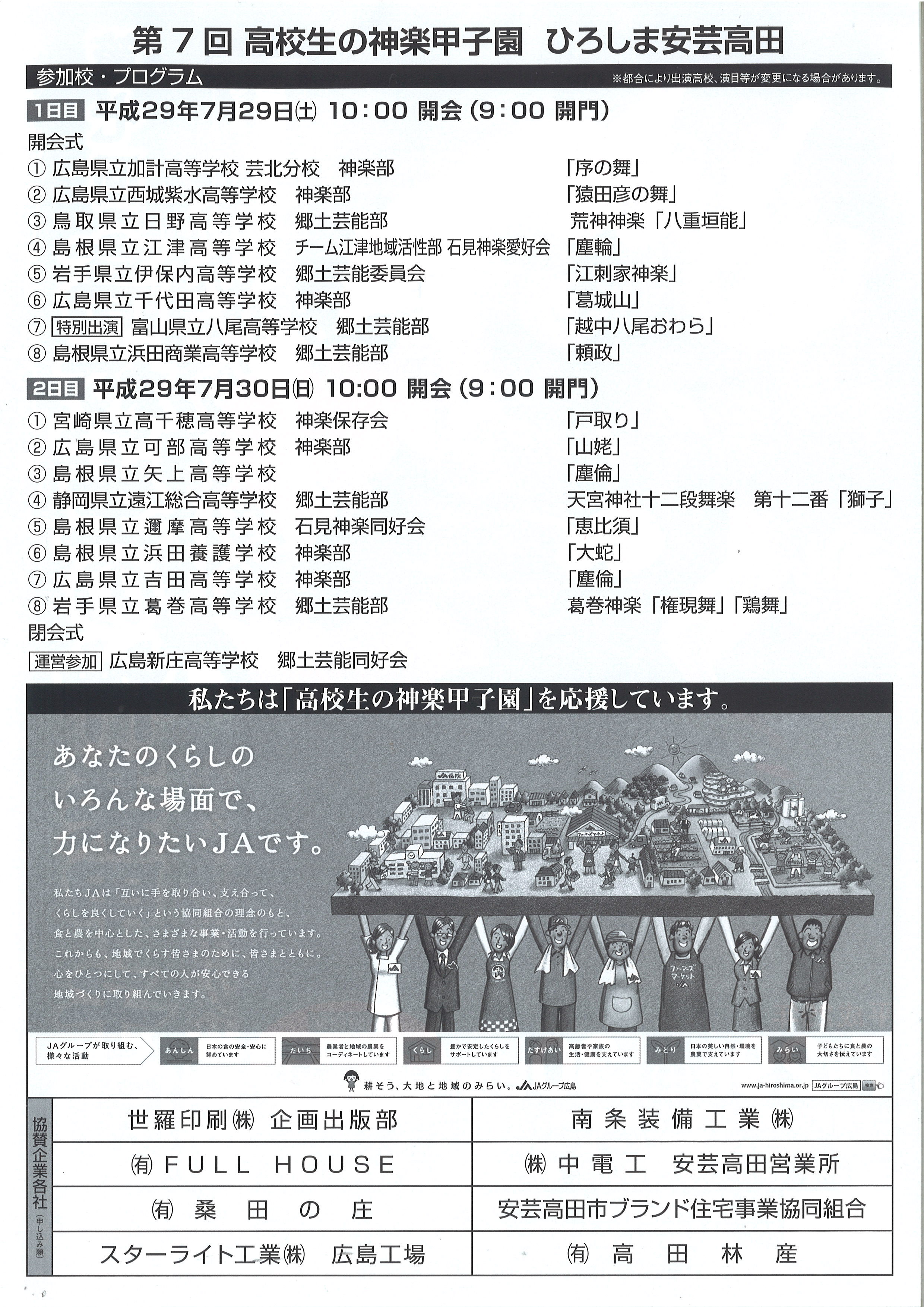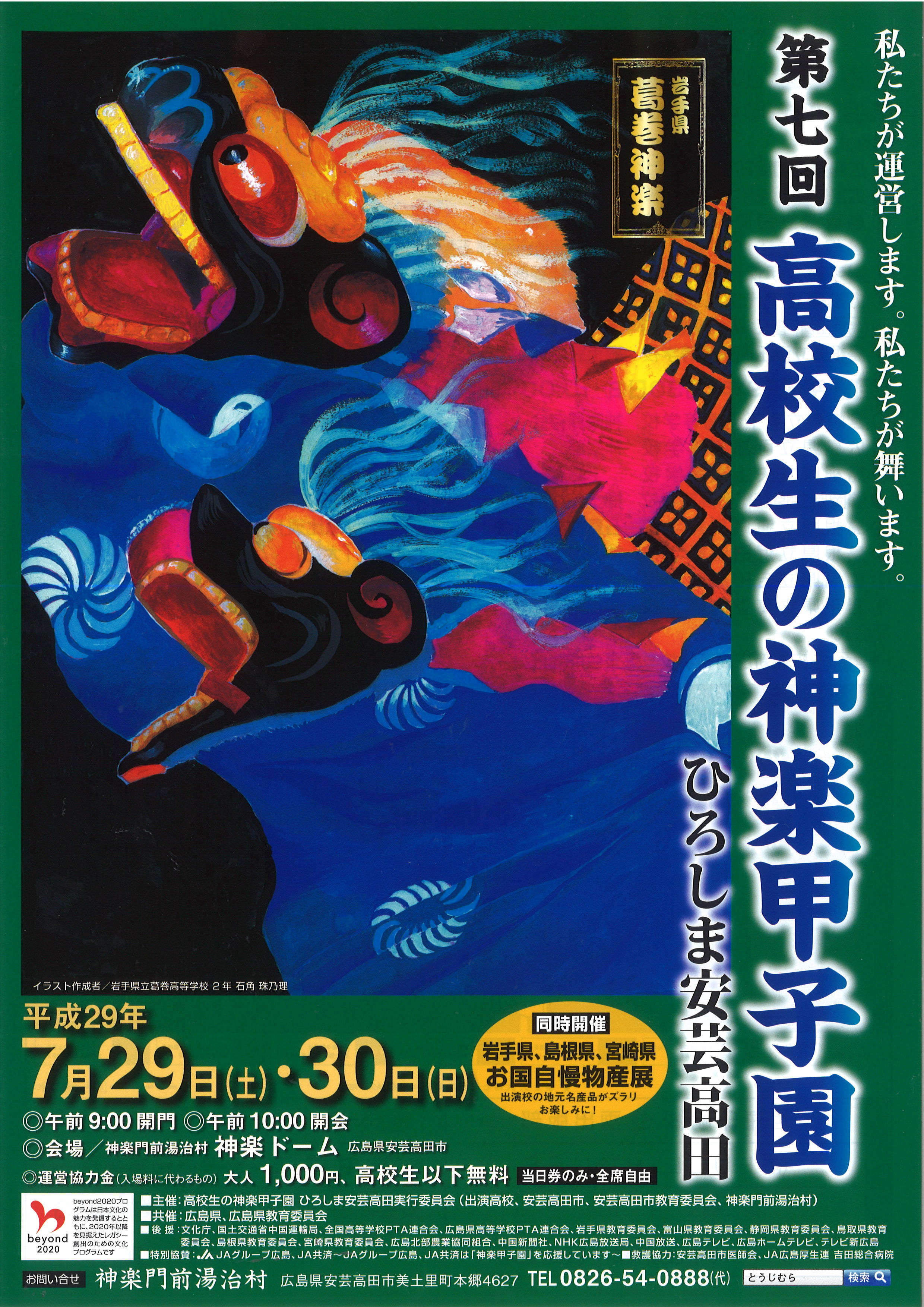 平成29年7月29日(土)、30日(日)に第7回高校生の神楽甲子園ひろしま安芸高田が開催されます。今年も全国から高校生が集い、日ごろ練習している伝統芸能「神楽」を披露されます。広島ではなかなか観る機会のない神楽も多くございます。ぜひご来場いただき、高校生へ声援をいただければと思います。