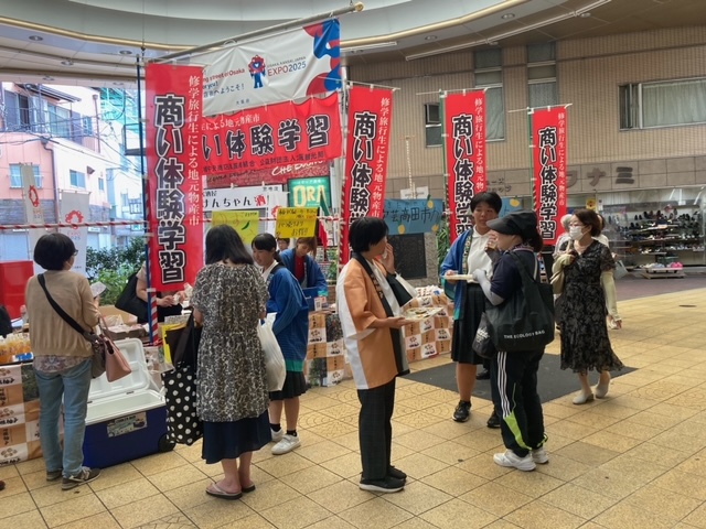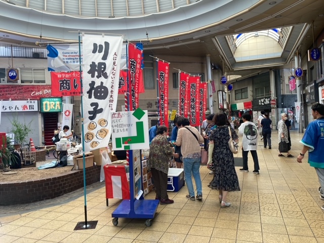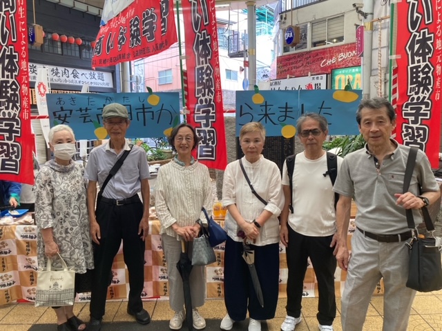 安芸高田市立高宮中学校商人体験が大阪市京橋中央通り商店街で行われました。今年は2年生10人が猛暑の中、地元川根柚子を使用した特産品の販売です。